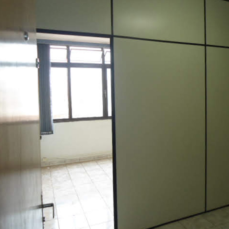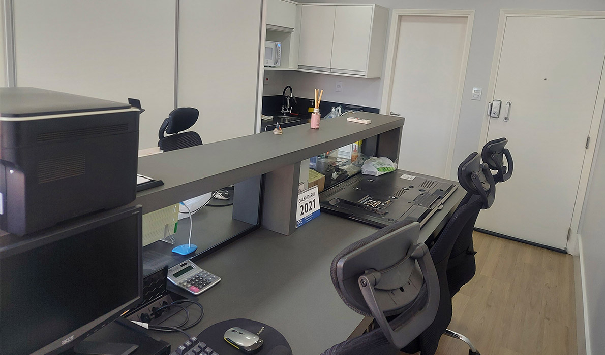 O partido era criar uma sala com ampla mesa e 6 postos de trabalho com ampla oferta de pontos de elétrica embutidos na mesa, forro de gesso, espaço para armazenar documentos e instalação de ar condicionado.