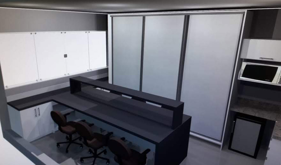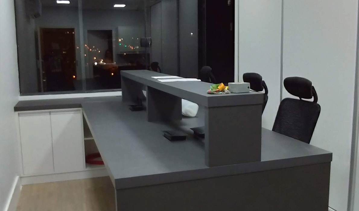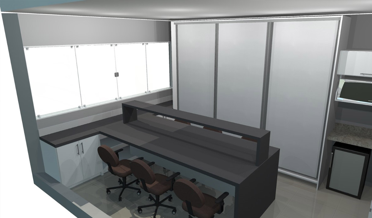 O partido era criar uma sala com ampla mesa e 6 postos de trabalho com ampla oferta de pontos de elétrica embutidos na mesa, forro de gesso, espaço para armazenar documentos e instalação de ar condicionado.