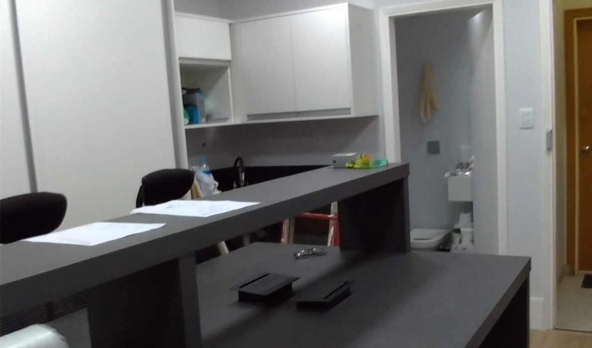 Nesse projeto foi refeita toda a parte elétrica e criados pontos de hidráulica para inserir uma pequena copa que não tinha e substituir a tubulação de hidro-sanitária. A janela em ferro totalmente enferrujada foi substituída por uma com mesma cor e modelo em alumínio.